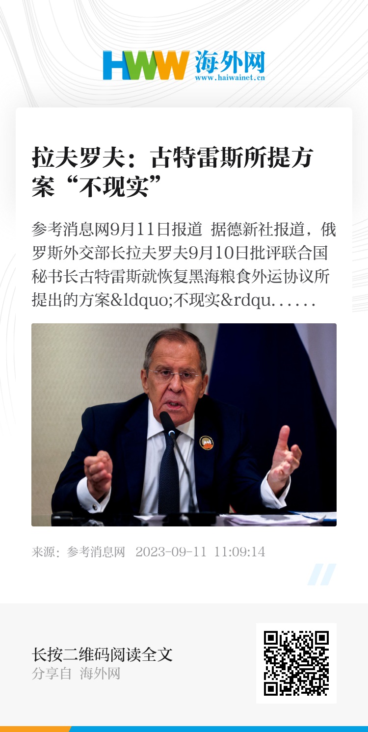 参考消息网9月11日报道 据德新社报道,俄罗斯外交部长拉夫罗夫9月10日批评联合国秘书长古特雷斯就恢复黑海粮食外运协议所提出的方案“不现实”。