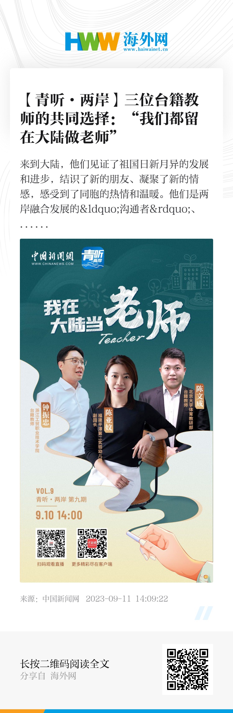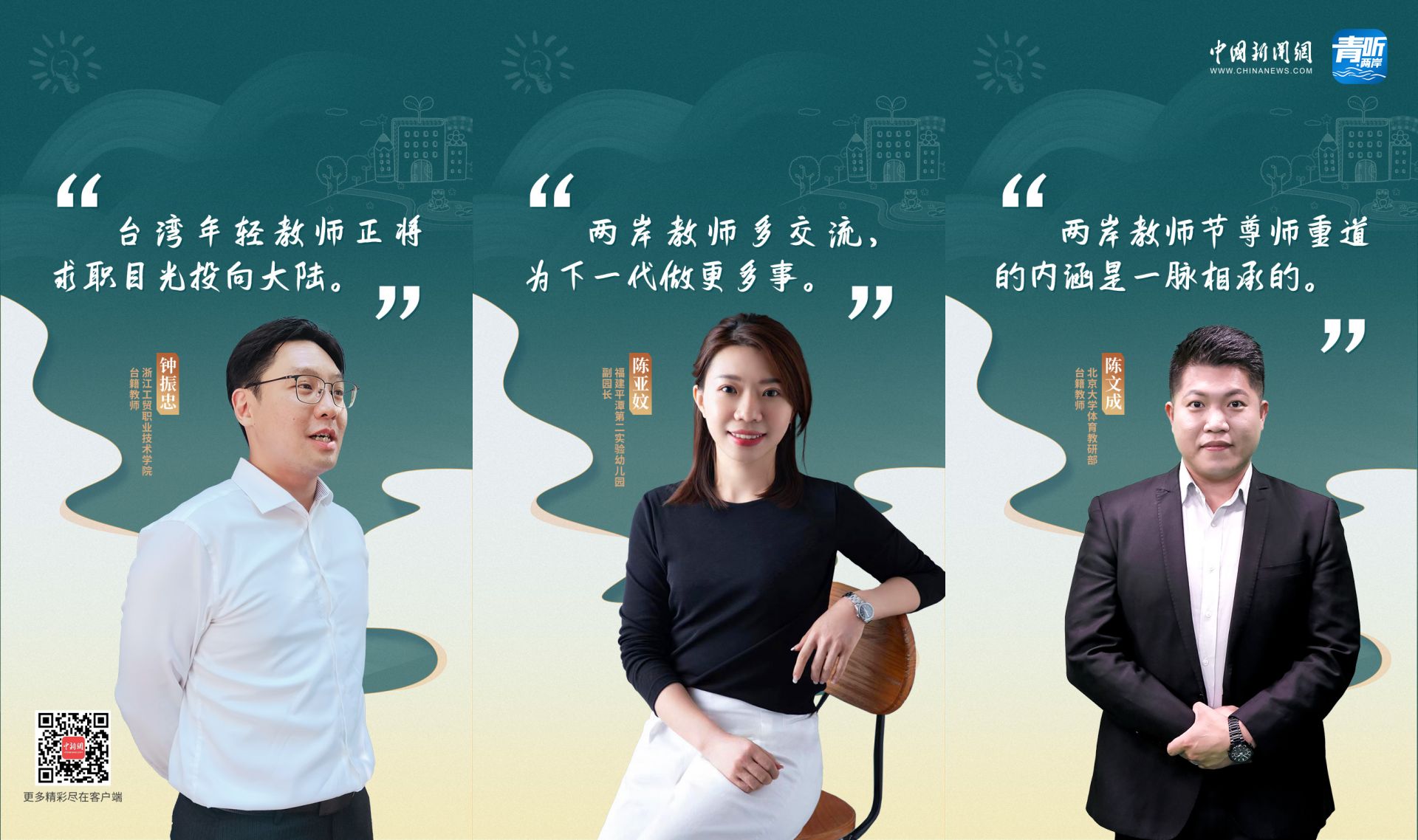 教师节这天,北京大学体育教研部教师陈文成、浙江工贸职业技术学院教师钟振忠、福建平潭第二实验幼儿园副园长陈亚妏,三位台籍教师做客中国新闻网《青听·两岸》栏目,分享了他们“登陆”做老师的故事。