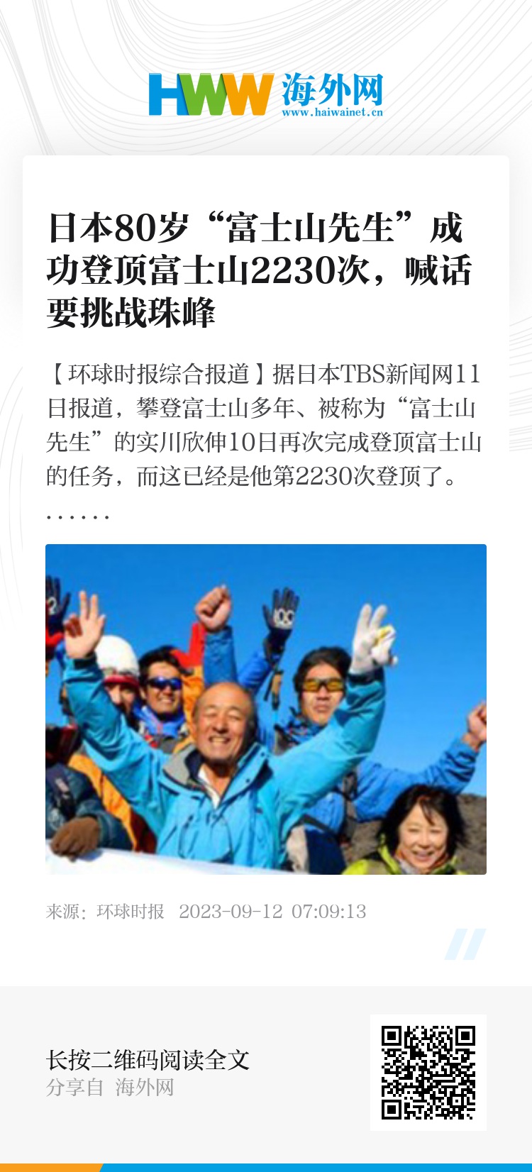 实川10日第2230次登顶富士山后喊话称,下一个目标是登顶2500次,未来还要挑战难度更高的珠穆朗玛峰。他说:“只要我还活着,就会一直爬下去。”在日语中,“富士山”的发音与数字“223”相同,实川之所以要在80岁实现登顶2230次的目标,也与此有关。(李 晓)