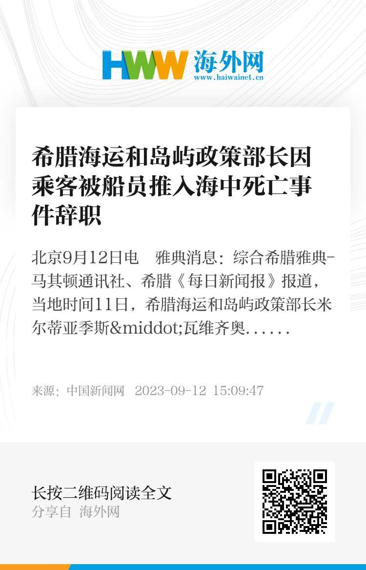中新网北京9月12日电 雅典消息:综合希腊雅典-马其顿通讯社、希腊《每日新闻报》报道,当地时间11日,希腊海运和岛屿政策部长米尔蒂亚季斯·瓦维齐奥蒂斯(Miltiadis Varvitsiotis)因乘客被船员推入海中死亡事件和其随后的不当言论向希腊总理基里亚科斯·米佐塔基斯(Kyriakos Mitsotakis)递交辞呈。