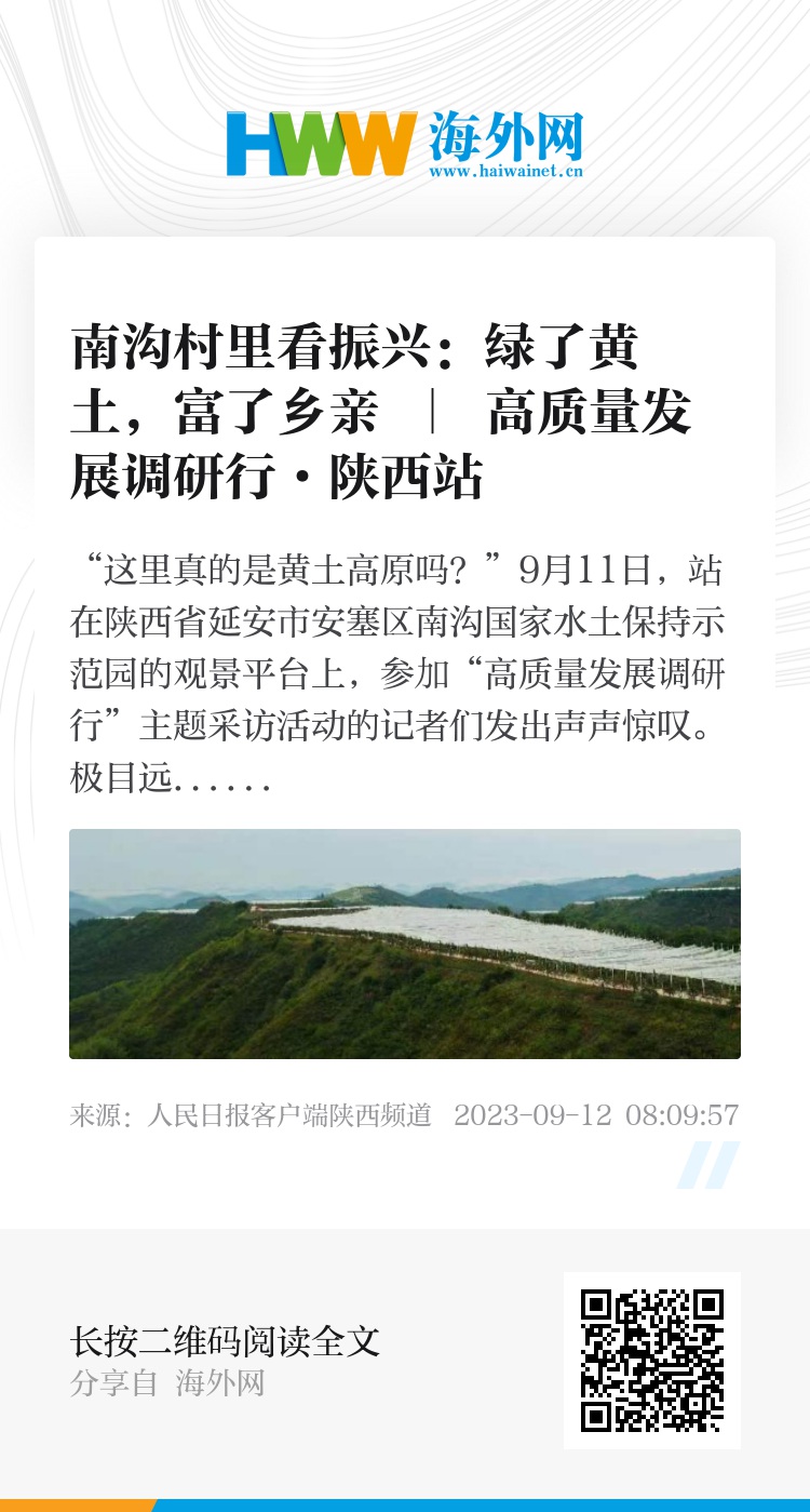 “这里真的是黄土高原吗?”9月11日,站在陕西省延安市安塞区南沟国家水土保持示范园的观景平台上,参加“高质量发展调研行”主题采访活动的记者们发出声声惊叹。极目远眺,不见黄土,只见绿色从脚下一直蔓延到天边,目之所及,塬上尽是一片青翠。