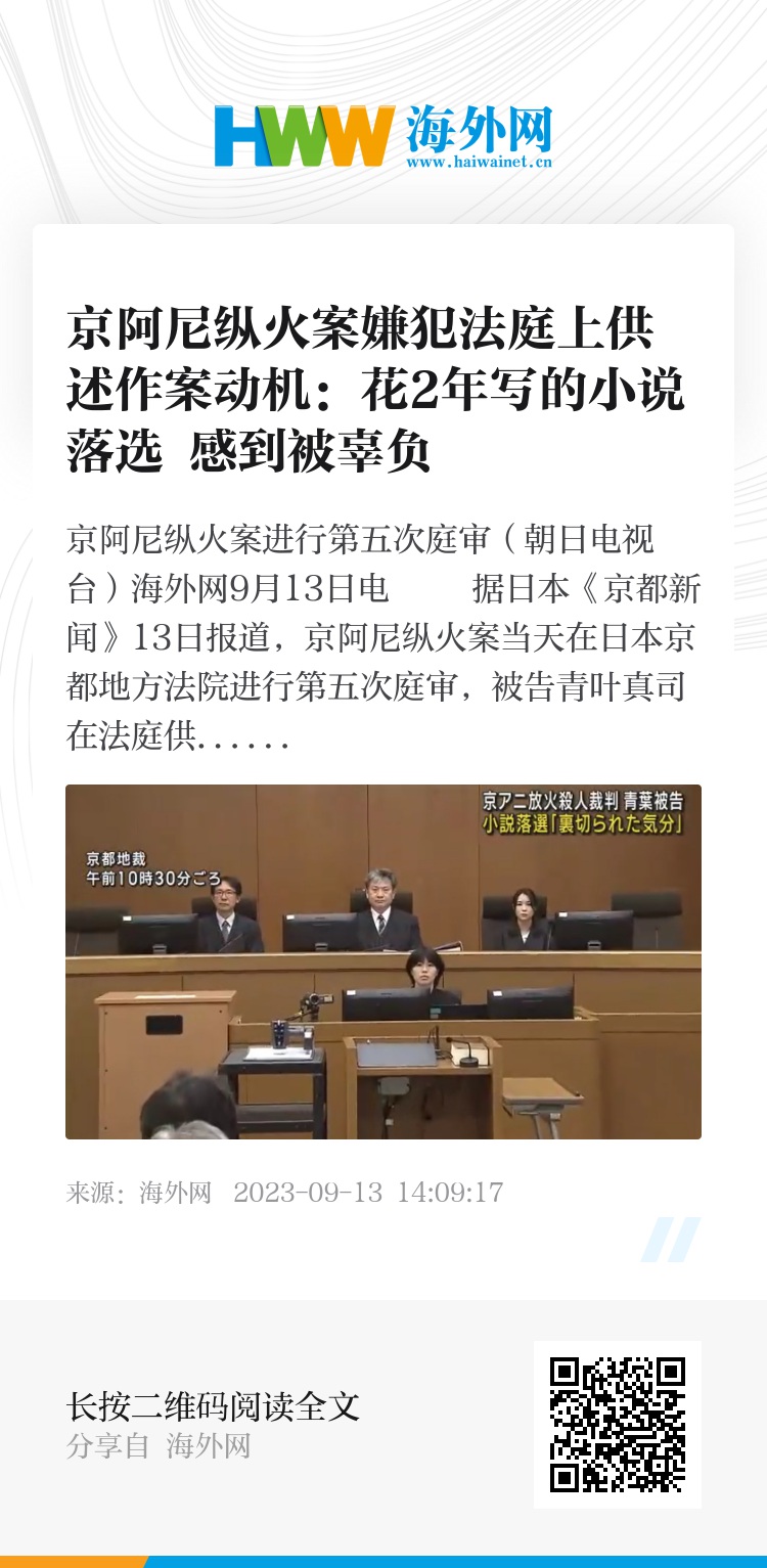 海外网9月13日电 据日本《京都新闻》13日报道,京阿尼纵火案当天在日本京都地方法院进行第五次庭审,被告青叶真司在法庭供述纵火动机称,他向京阿尼投稿写了2年的小说,却最终落选,感到极度失望,“被辜负了”。
