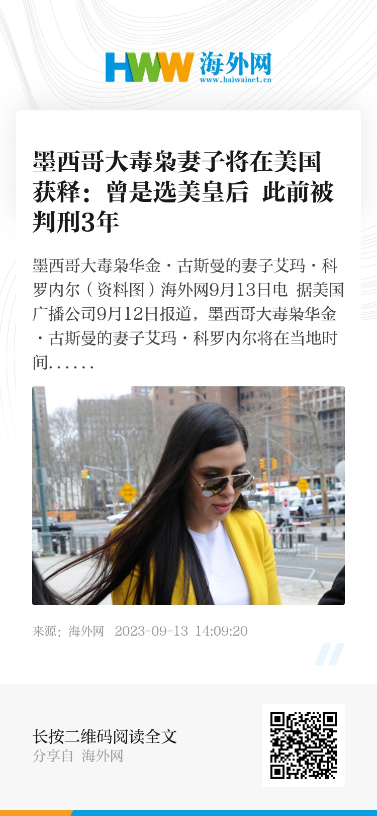 海外网9月13日电 据美国广播公司9月12日报道,墨西哥大毒枭华金·古斯曼的妻子艾玛·科罗内尔将在当地时间13日从洛杉矶获释,她在此前因贩毒相关罪名被判处3年监禁。