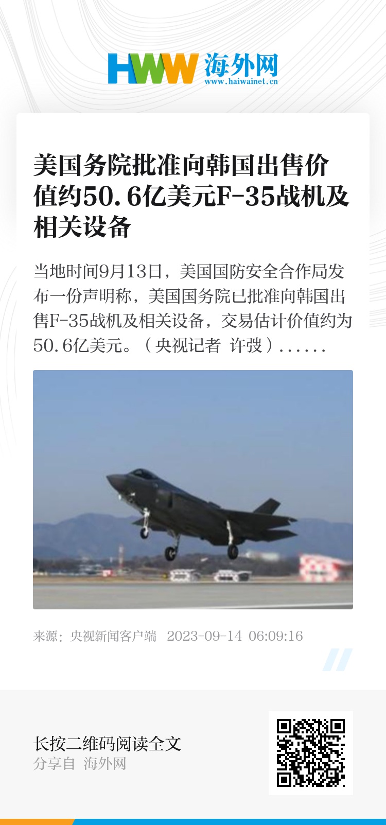 当地时间9月13日,美国国防安全合作局发布一份声明称,美国国务院已批准向韩国出售F-35战机及相关设备,交易估计价值约为50.6亿美元。(央视记者 许弢)