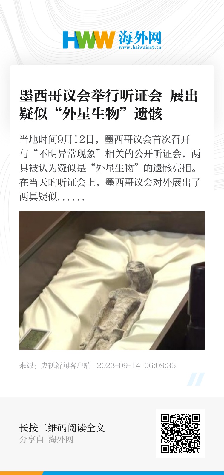 当地时间9月12日,墨西哥议会首次召开与“不明异常现象”相关的公开听证会,两具被认为疑似是“外星生物”的遗骸亮相。