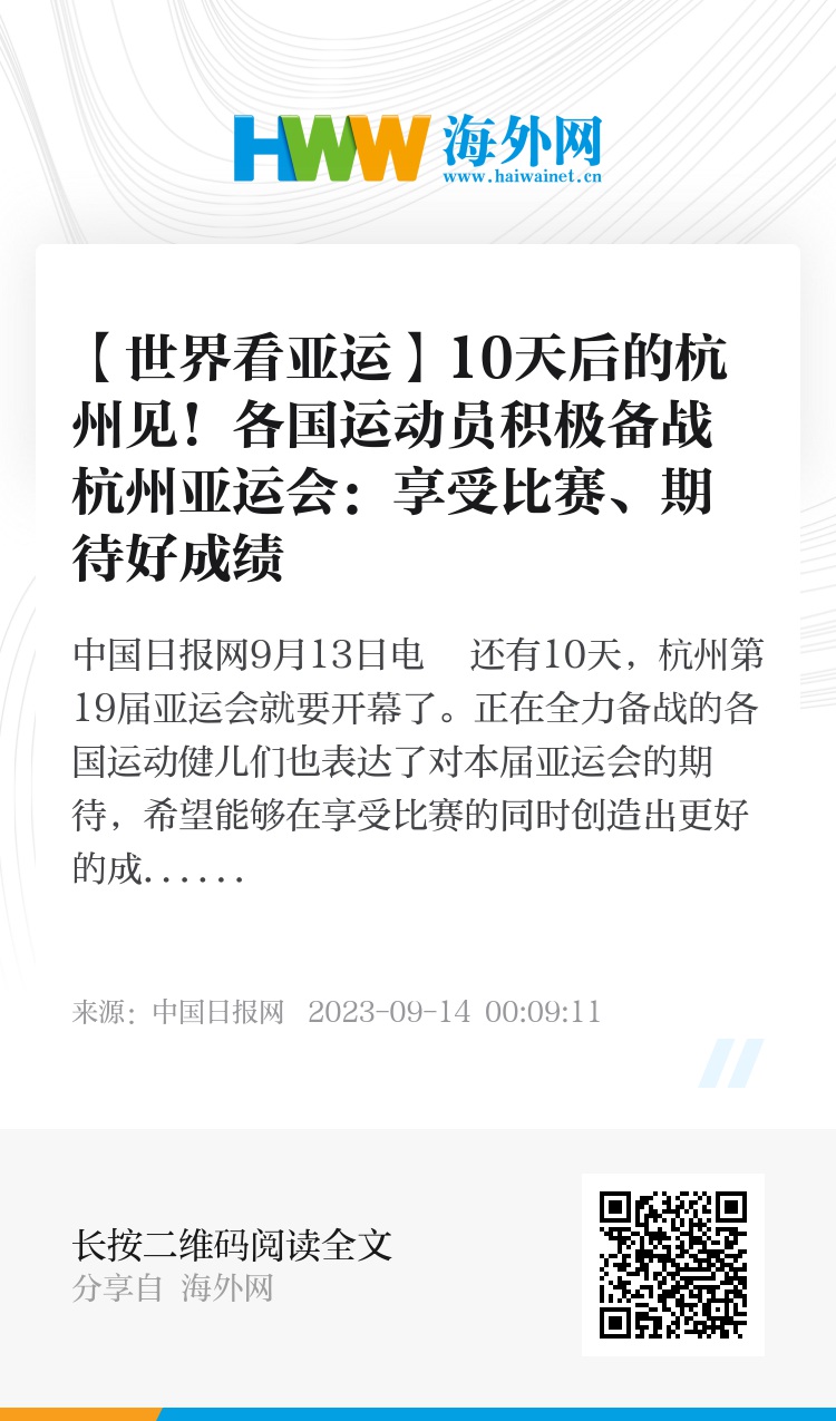 中国日报网9月13日电 还有10天,杭州第19届亚运会就要开幕了。正在全力备战的各国运动健儿们也表达了对本届亚运会的期待,希望能够在享受比赛的同时创造出更好的成绩。