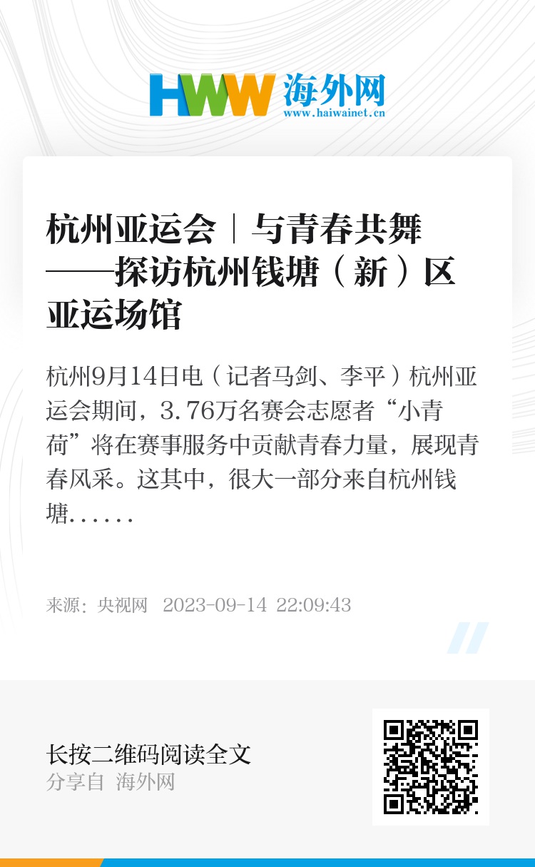 新华社杭州9月14日电(记者马剑、李平)杭州亚运会期间,3.76万名赛会志愿者“小青荷”将在赛事服务中贡献青春力量,展现青春风采。这其中,很大一部分来自杭州钱塘(新)区的高校。