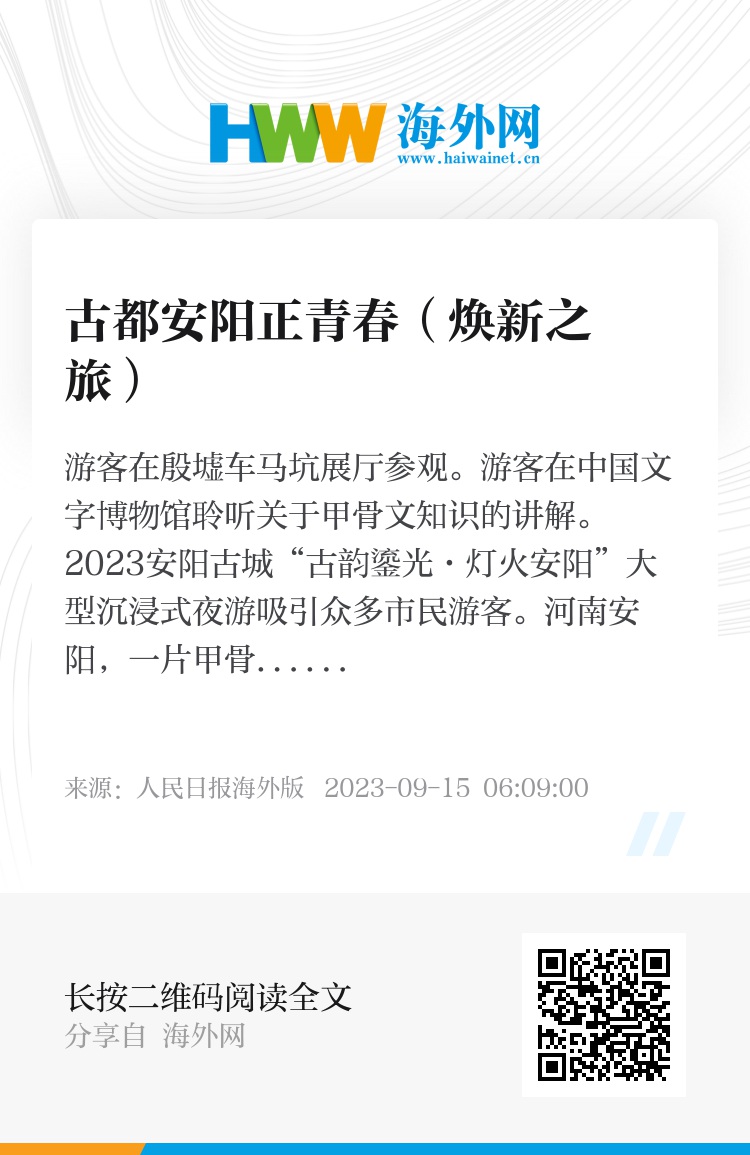记者从安阳市文化广电体育旅游局了解到,安阳正聚焦“汉文字”的文化优势,全力赋能“殷墟甲骨文”历史文化标识,着力打造“中华字都”,建设国际旅游目的地城市,走出一条文脉传承创新、文旅深度融合的发展新路子。安阳将赓续历史文脉,抓好殷墟遗址保护与中华优秀传统文化传承创新;注重品质提升,提高“吃住行游购娱”全链条服务能力;丰富旅游业态,大力发展新文旅;强化数智赋能,提升文旅智慧化水平等。(本报记者 赵 珊文/图)