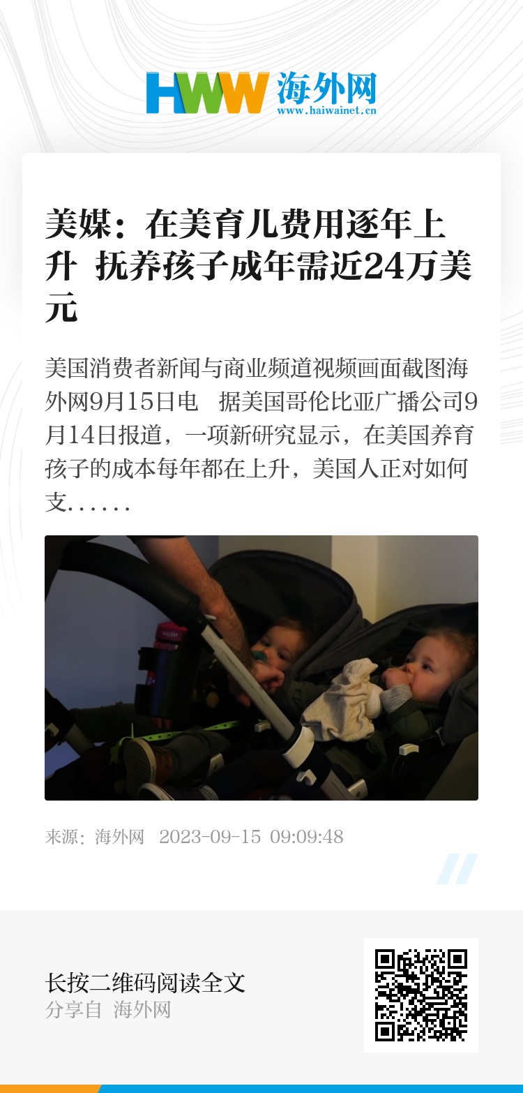 海外网9月15日电 据美国哥伦比亚广播公司9月14日报道,一项新研究显示,在美国养育孩子的成本每年都在上升,美国人正对如何支付抚养孩子的费用“感到恐惧”。