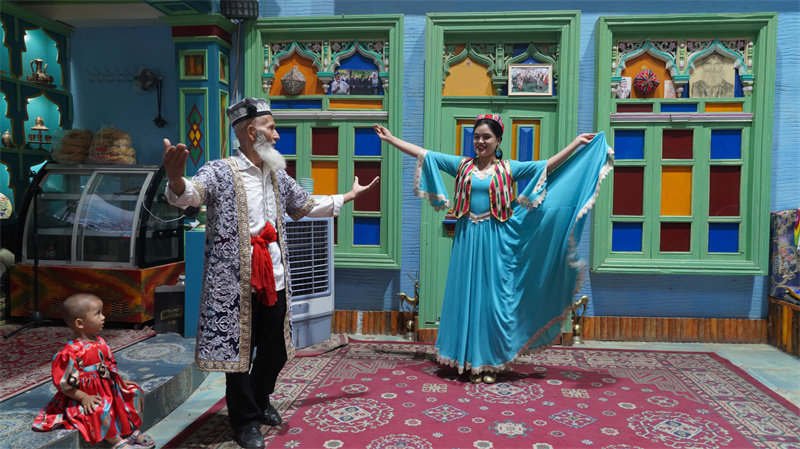 沙拉麦提古丽·卡日的爷爷在“古丽的家”为游客表演舞蹈。人民网记者 陈新辉摄