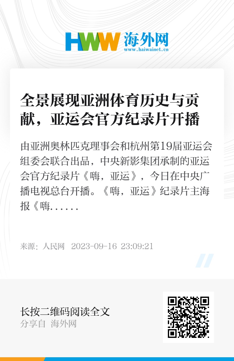 由亚洲奥林匹克理事会和杭州第19届亚运会组委会联合出品,中央新影集团承制的亚运会官方纪录片《嗨,亚运》,今日在中央广播电视总台开播。