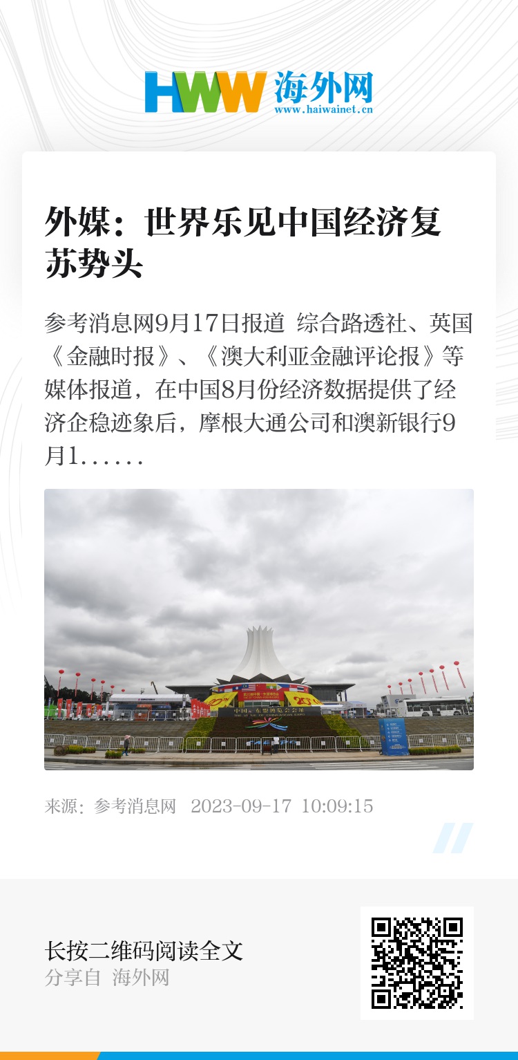 参考消息网9月17日报道 综合路透社、英国《金融时报》、《澳大利亚金融评论报》等媒体报道,在中国8月份经济数据提供了经济企稳迹象后,摩根大通公司和澳新银行9月15日上调了对这个世界第二大经济体2023年经济增长率的预测。