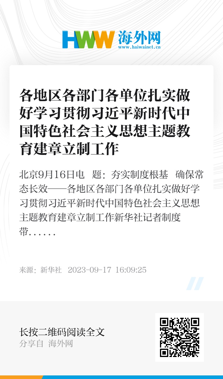 新华社北京9月16日电 题:夯实制度根基 确保常态长效——各地区各部门各单位扎实做好学习贯彻习近平新时代中国特色社会主义思想主题教育建章立制工作