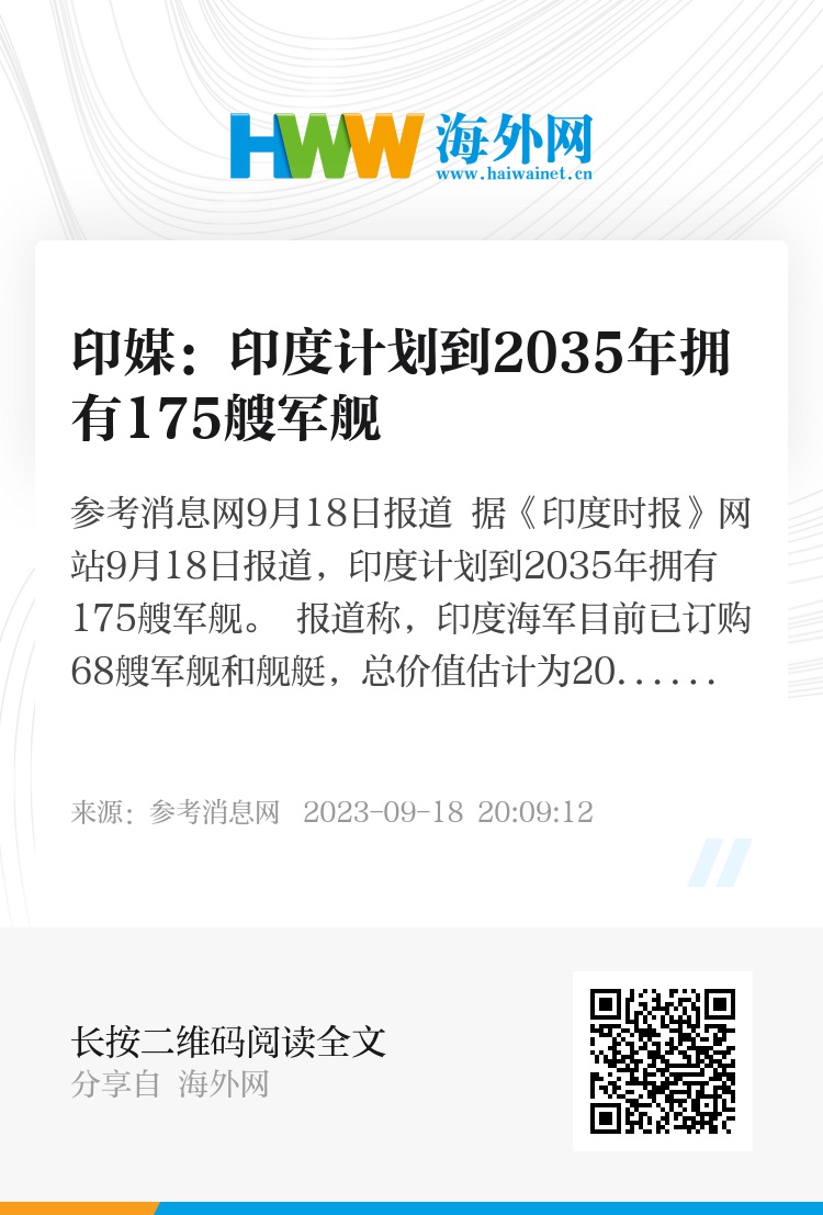 参考消息网9月18日报道 据《印度时报》网站9月18日报道,印度计划到2035年拥有175艘军舰。