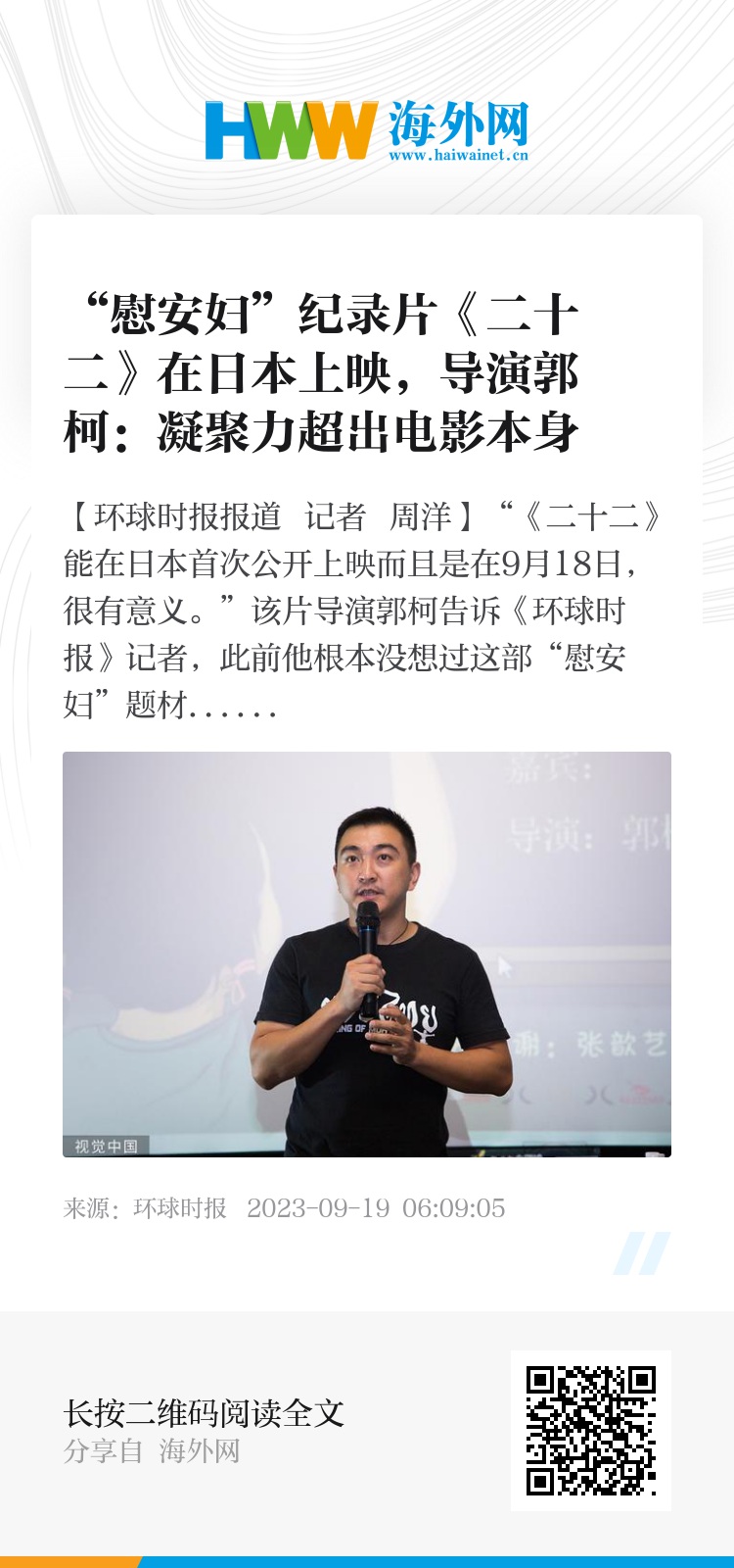【环球时报报道 记者 周洋】“《二十二》能在日本首次公开上映而且是在9月18日,很有意义。”该片导演郭柯告诉《环球时报》记者,此前他根本没想过这部“慰安妇”题材纪录片能在日本公开放映。主创团队曾考虑报名参加东京电影节或参加其他日本展映活动,但未得到回应。如今,在该片拍摄完成近10年后、在中国国内上映6年后,终于有机会在日本上映,正如郭柯在微博中所说,“让更多人看到,是我们的愿望;让应该看到的人看到,是我们的责任”。