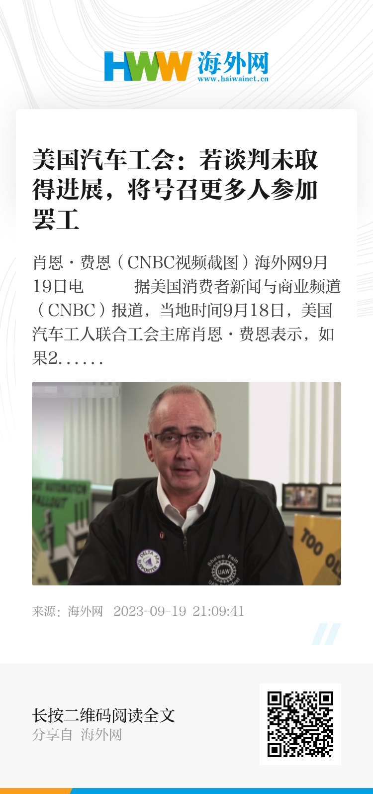 海外网9月19日电 据美国消费者新闻与商业频道(CNBC)报道,当地时间9月18日,美国汽车工人联合工会主席肖恩·费恩表示,如果22日中午之前在谈判中没有取得“重大进展”,工会将号召更多工厂的工人进行罢工。