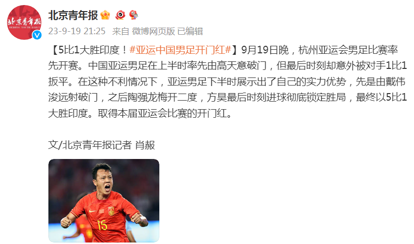 9月19日晚,杭州亚运会男足比赛率先开赛。中国亚运男足在上半时率先由高天意破门,但最后时刻却意外被对手1比1扳平。在这种不利情况下,亚运男足下半时展示出了自己的实力优势,先是由戴伟浚远射破门,之后陶强龙梅开二度,方昊最后时刻进球彻底锁定胜局,最终以5比1大胜印度。取得本届亚运会比赛的开门红。