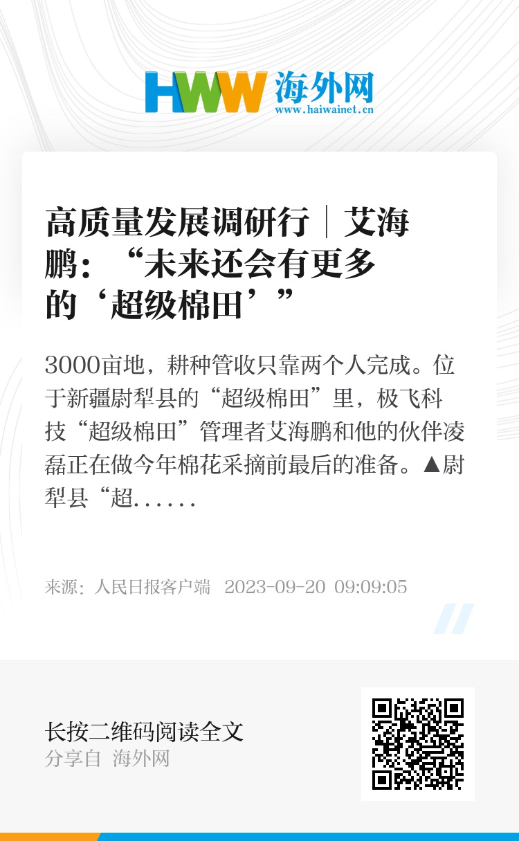 据艾海鹏介绍,随着“超级棉田”模式的成熟,设备成本的降低,今年极飞科技将召开产品发布会,全面推广基于机器人和软件的“超级棉田”模式。“随着越来越多农户的加入,未来还会有更多的‘超级棉田’。”(人民日报记者 张义钊 白阳)