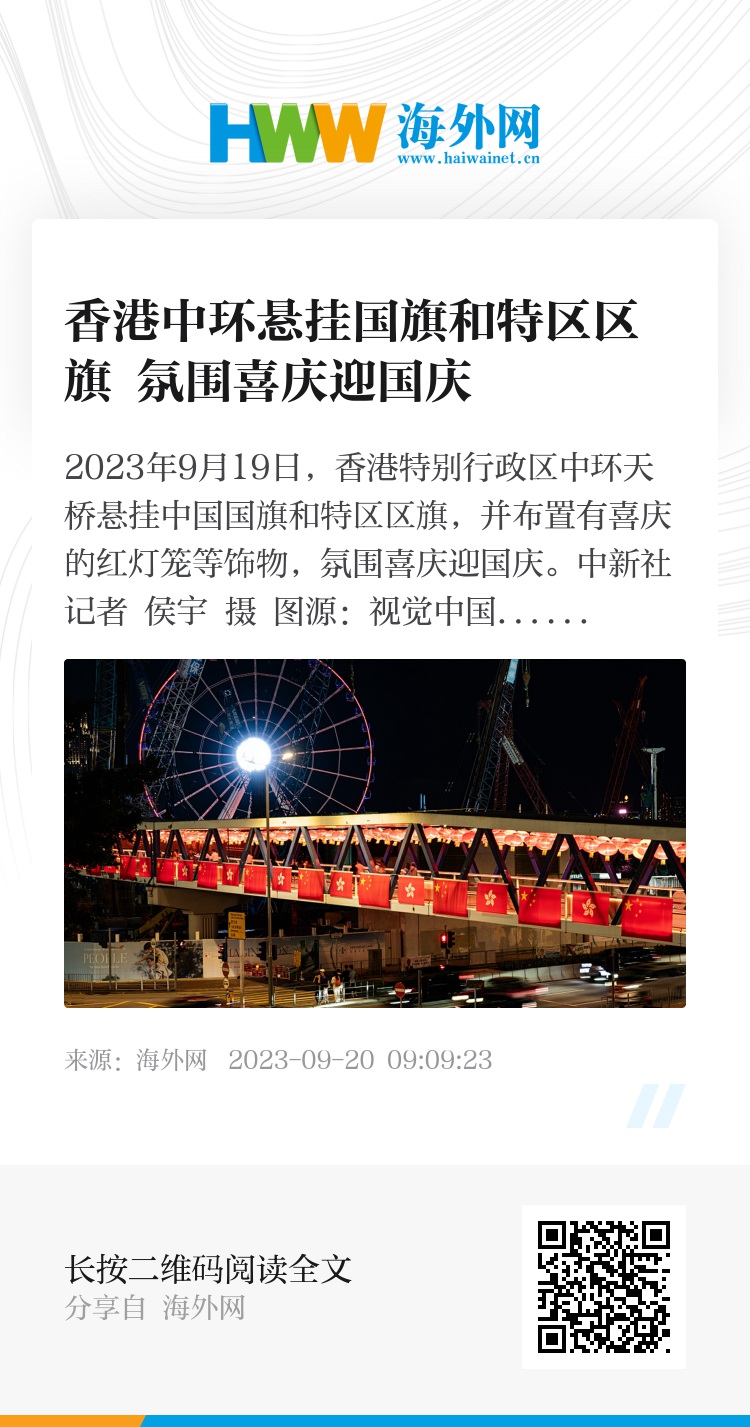 特别行政区中环天桥悬挂中国国旗和特区区旗,并布置有喜庆的红灯笼等饰物,氛围喜庆迎国庆。中新社记者 侯宇 摄 图源:视觉中国