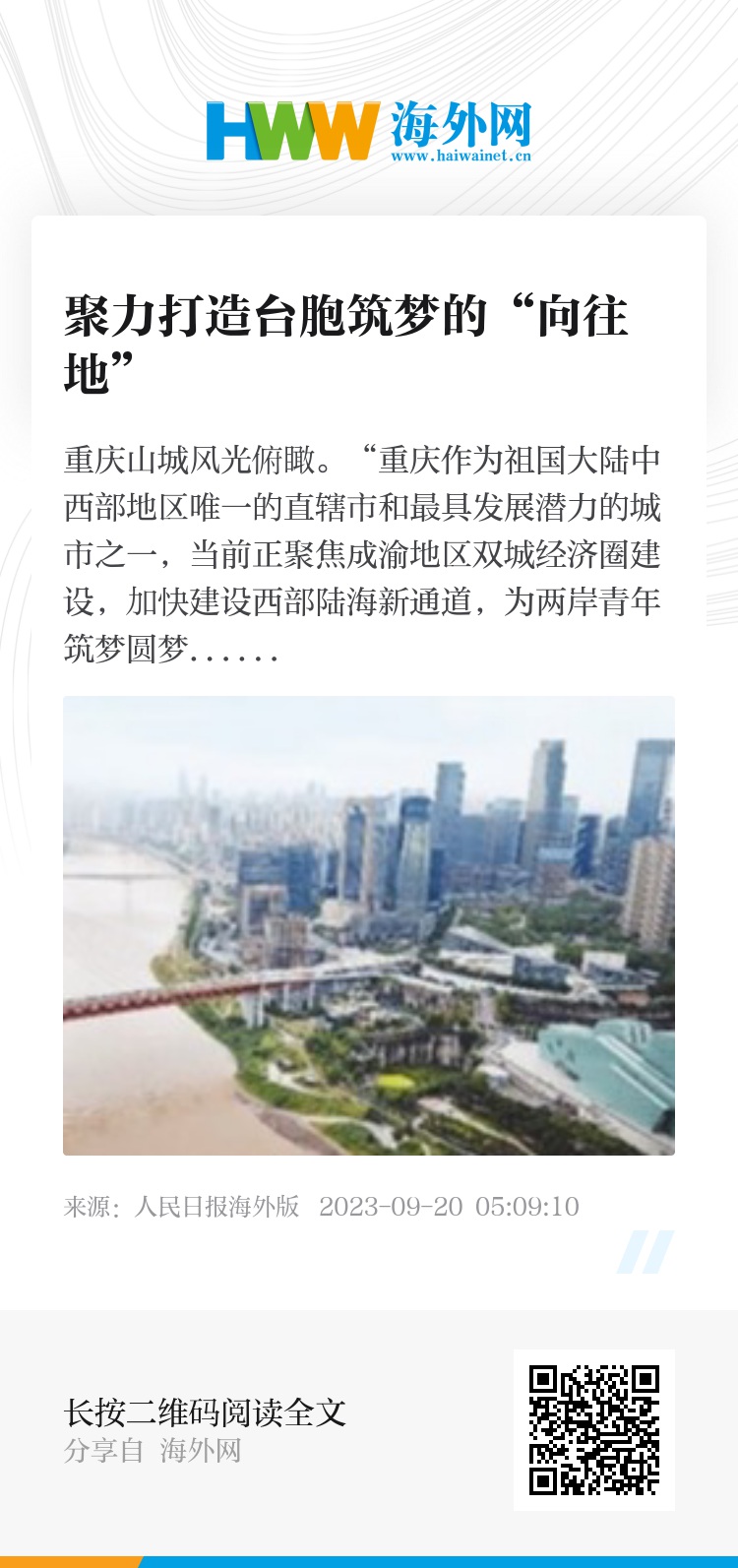 “重庆作为祖国大陆中西部地区唯一的直辖市和最具发展潜力的城市之一,当前正聚焦成渝地区双城经济圈建设,加快建设西部陆海新通道,为两岸青年筑梦圆梦创造了广阔空间。”第十五届“重庆·台湾周”近日在重庆举办,两岸企业家峰会中小企业合作及青年创业推进小组大陆方面召集人张卫国说,希望广大青年朋友充分把握机遇,实现人生价值。