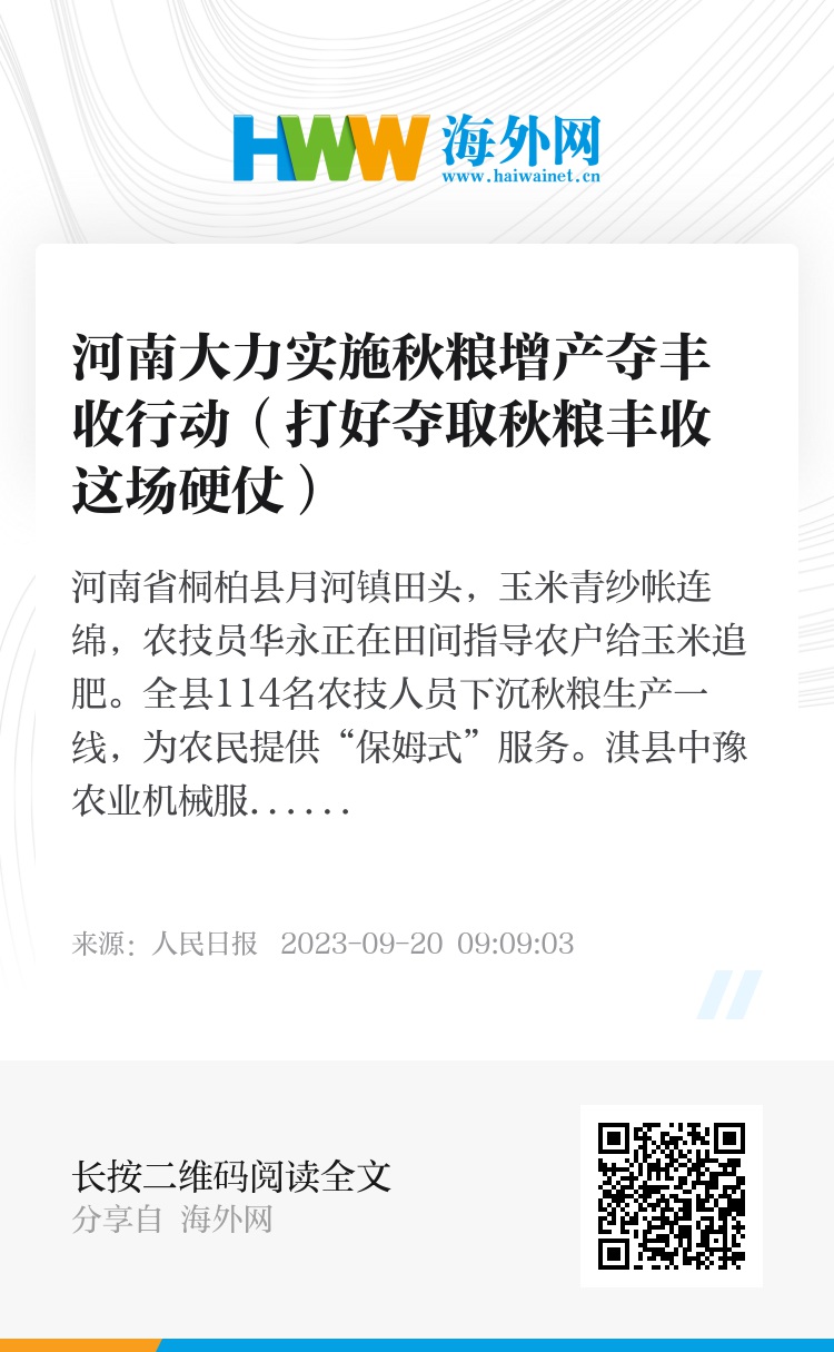 秋粮是全年粮食生产的大头。作为粮食生产大省,“中原粮仓”河南坚决扛稳粮食安全重任,大力实施秋粮增产夺丰收行动,毫不放松抓好田间管理,确保全年粮食产量稳定在1300亿斤以上,努力在高基点上实现粮食生产新突破。