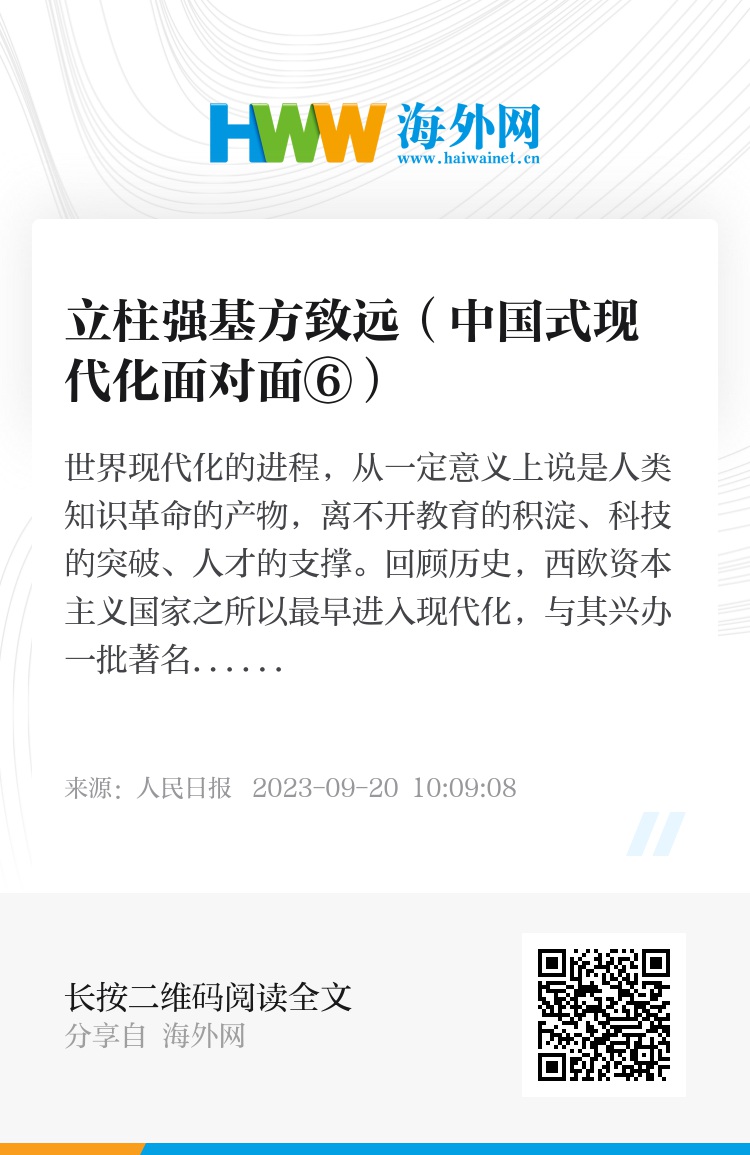 推进中国式现代化,长远之策必须靠教育、科技、人才。这是历史发展的结论,更是面向未来的必然。党的二十大报告站在我国社会主义现代化建设事业长远发展的战略高度,把教育、科技、人才作为基础性、战略性支撑,摆在极为重要的位置,对实施科教兴国战略、强化现代化建设人才支撑作出专章部署,提出加快建设教育强国、科技强国、人才强国的目标任务,着力夯实全面建设社会主义现代化国家、全面推进中华民族伟大复兴的智力支持和人才保障。