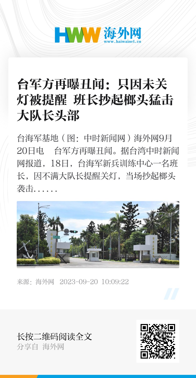 海外网9月20日电 台军方再曝丑闻。据台湾中时新闻网报道,18日,台海军新兵训练中心一名班长,因不满大队长提醒关灯,当场抄起榔头袭击对方,致其受伤。