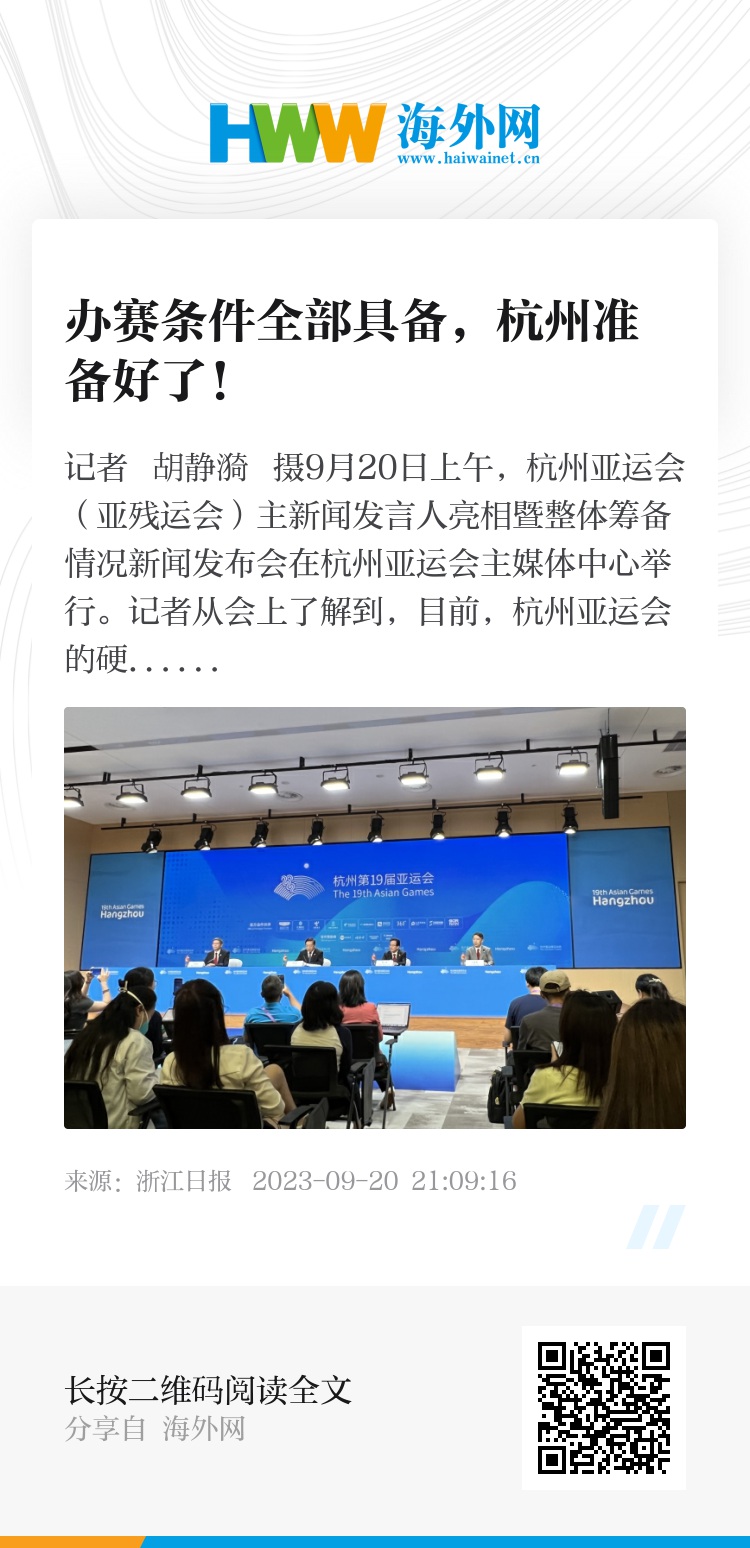 9月20日上午,杭州亚运会(亚残运会)主新闻发言人亮相暨整体筹备情况新闻发布会在杭州亚运会主媒体中心举行。记者从会上了解到,目前,杭州亚运会的硬件建设全部完成、软件布局全部到位、办赛条件全部具备。