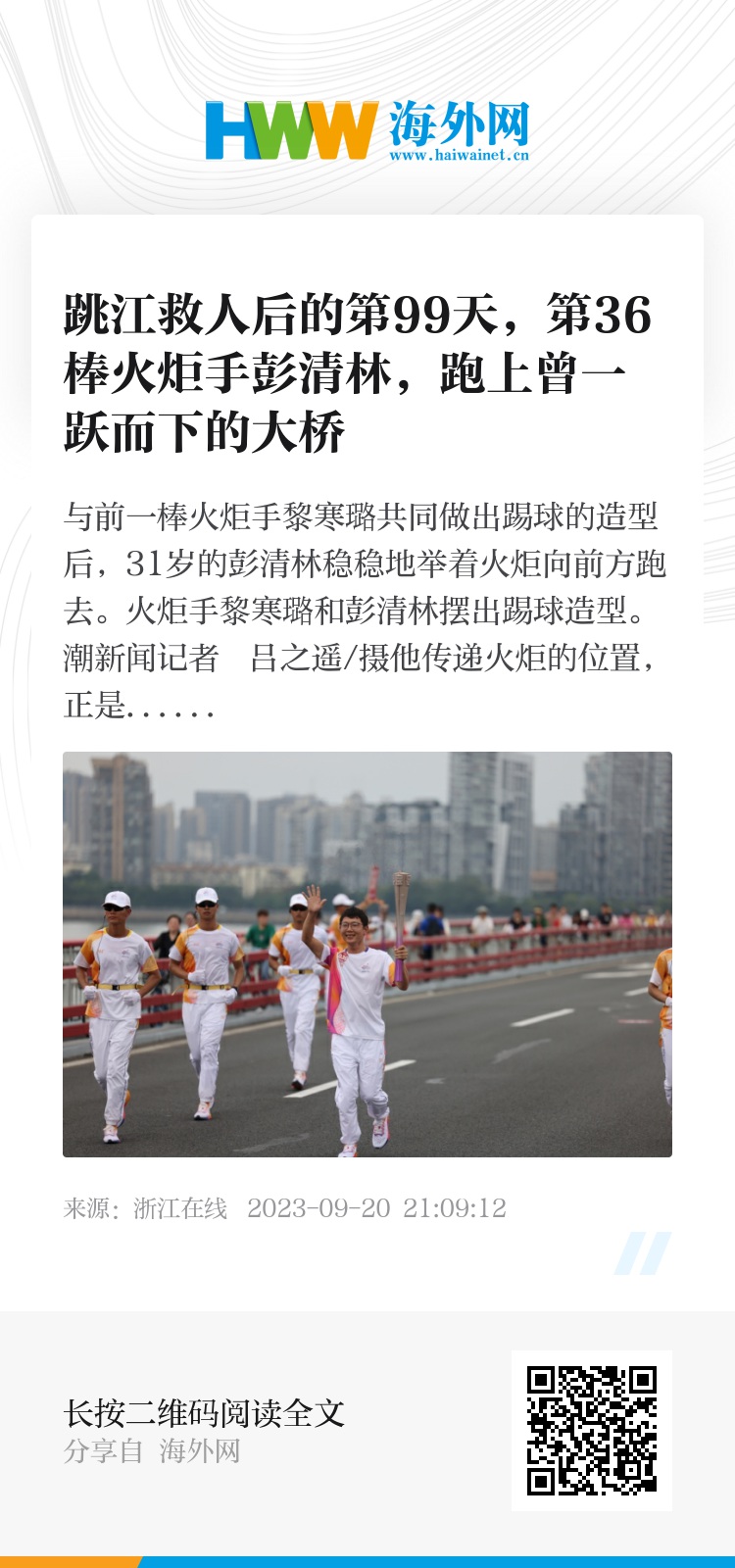 跳江救人时,他是外卖小哥彭清林。此时,昂首挺胸向前跑的是火炬手彭清林。举着火炬,跑过自己救过人的大桥,彭清林对潮新闻记者说:“这种感觉太不可思议啦,也很美妙,更感到光荣。”