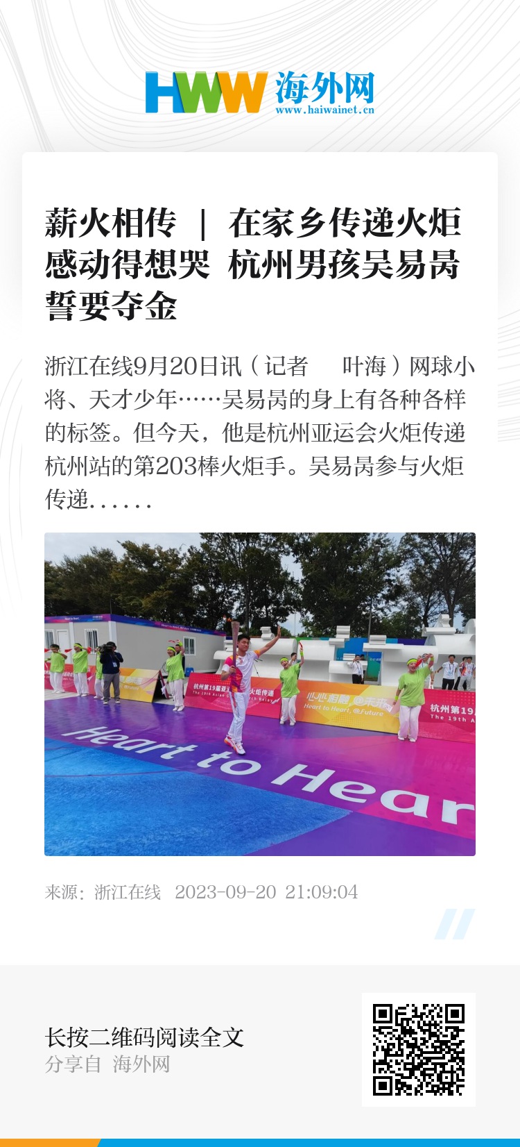 浙江在线9月20日讯(记者 叶海)网球小将、天才少年……吴易昺的身上有各种各样的标签。但今天,他是杭州亚运会火炬传递杭州站的第203棒火炬手。