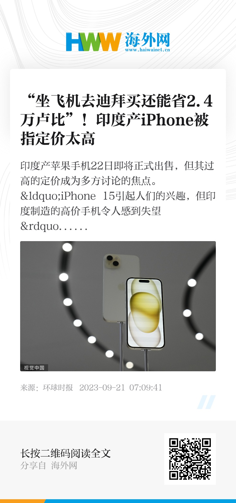 印度产苹果手机22日即将正式出售,但其过高的定价成为多方讨论的焦点。“iPhone 15引起人们的兴趣,但印度制造的高价手机令人感到失望”,印度moneycontrol网站报道称。由于是印度制造,消费者预期iPhone 15价格会较低,但根据目前公布的价格,印度造苹果手机价格甚至更高。印度孟买和德里的苹果专卖店已经开始预订9月22日发售的印度造iPhone 15,但有部分顾客已经表示决不会购买。