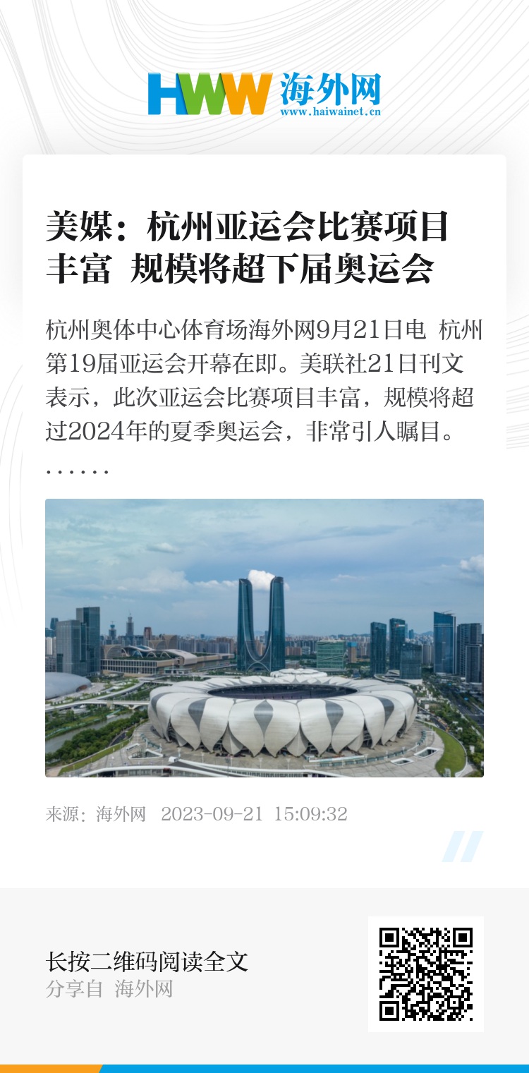 海外网9月21日电 杭州第19届亚运会开幕在即。美联社21日刊文表示,此次亚运会比赛项目丰富,规模将超过2024年的夏季奥运会,非常引人瞩目。