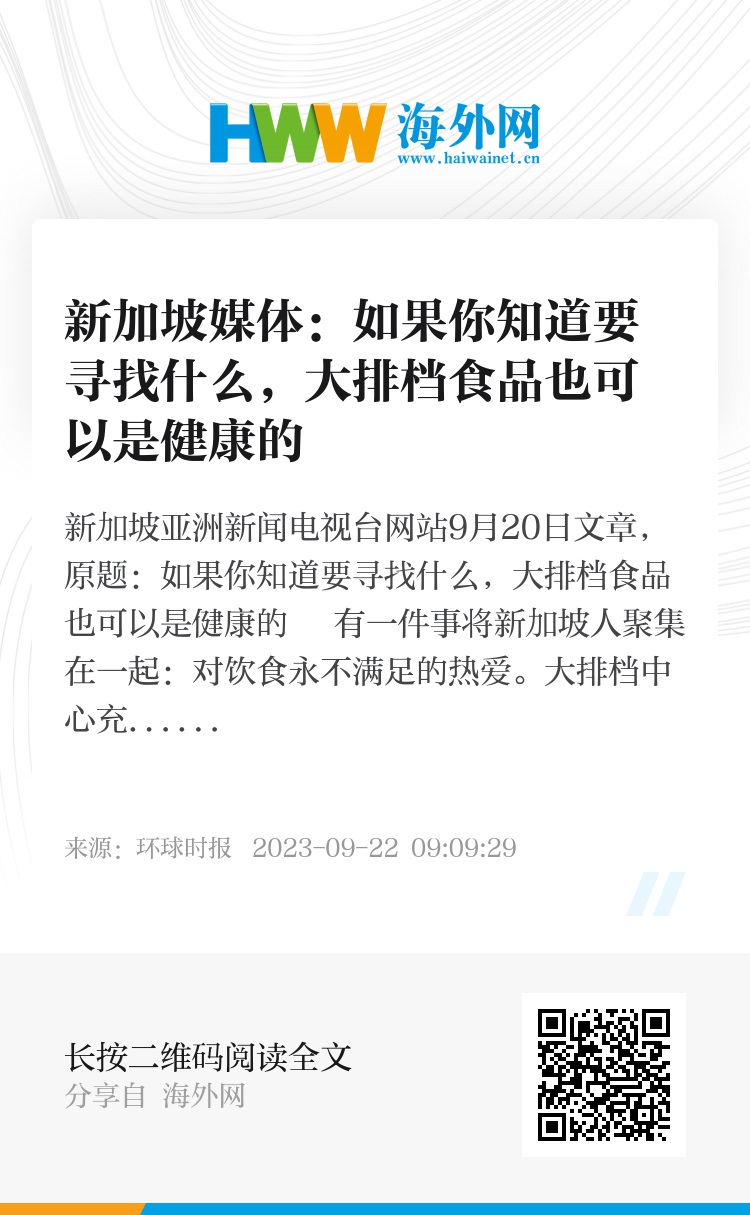 新加坡亚洲新闻电视台网站9月20日文章,原题:如果你知道要寻找什么,大排档食品也可以是健康的 有一件事将新加坡人聚集在一起:对饮食永不满足的热爱。大排档中心充满生机,提供不需要花多少钱就能享用的各种色香味俱全的美食。这些中心不仅是迅速享用美食的地方,还是最讲究便利和选择的饮食文化的核心和灵魂所在。2010年的一项全国调查显示,约60%的新加坡居民每周至少外出就餐4次。按照2020 年发表的另一篇文章,83%的新加坡居民对大排档的热爱使他们每周至少一次在这些场所享用当地美食。这里的大排档文化甚至被列入联合国教科文组织非遗名录。