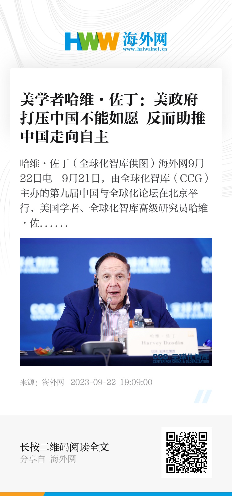 海外网9月22日电 9月21日,由全球化智库(CCG)主办的第九届中国与全球化论坛在北京举行,美国学者、全球化智库高级研究员哈维·佐丁出席活动并接受海外网专访。他认为美政府执意打压中国并不能如愿,反而助推中国走向自主。