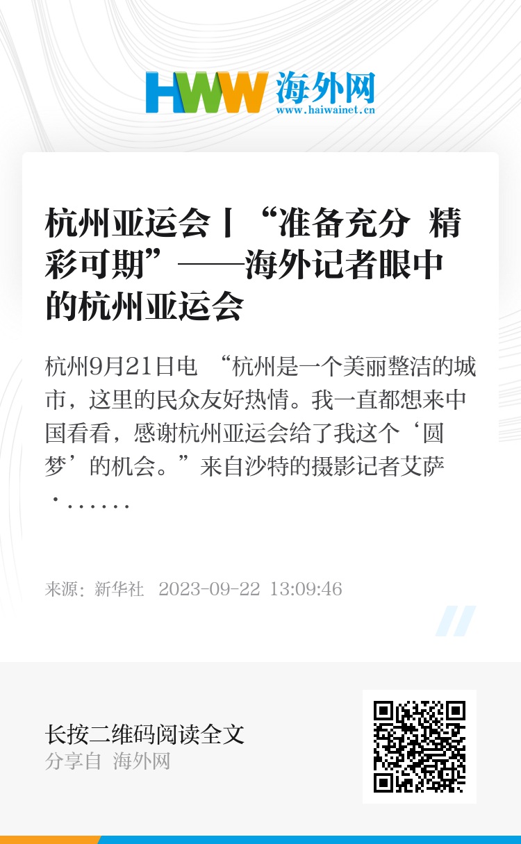 新华社杭州9月21日电 “杭州是一个美丽整洁的城市,这里的民众友好热情。我一直都想来中国看看,感谢杭州亚运会给了我这个‘圆梦’的机会。”来自沙特的摄影记者艾萨·阿卜杜拉说。