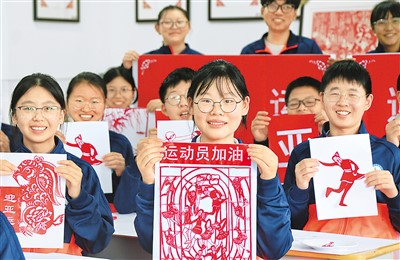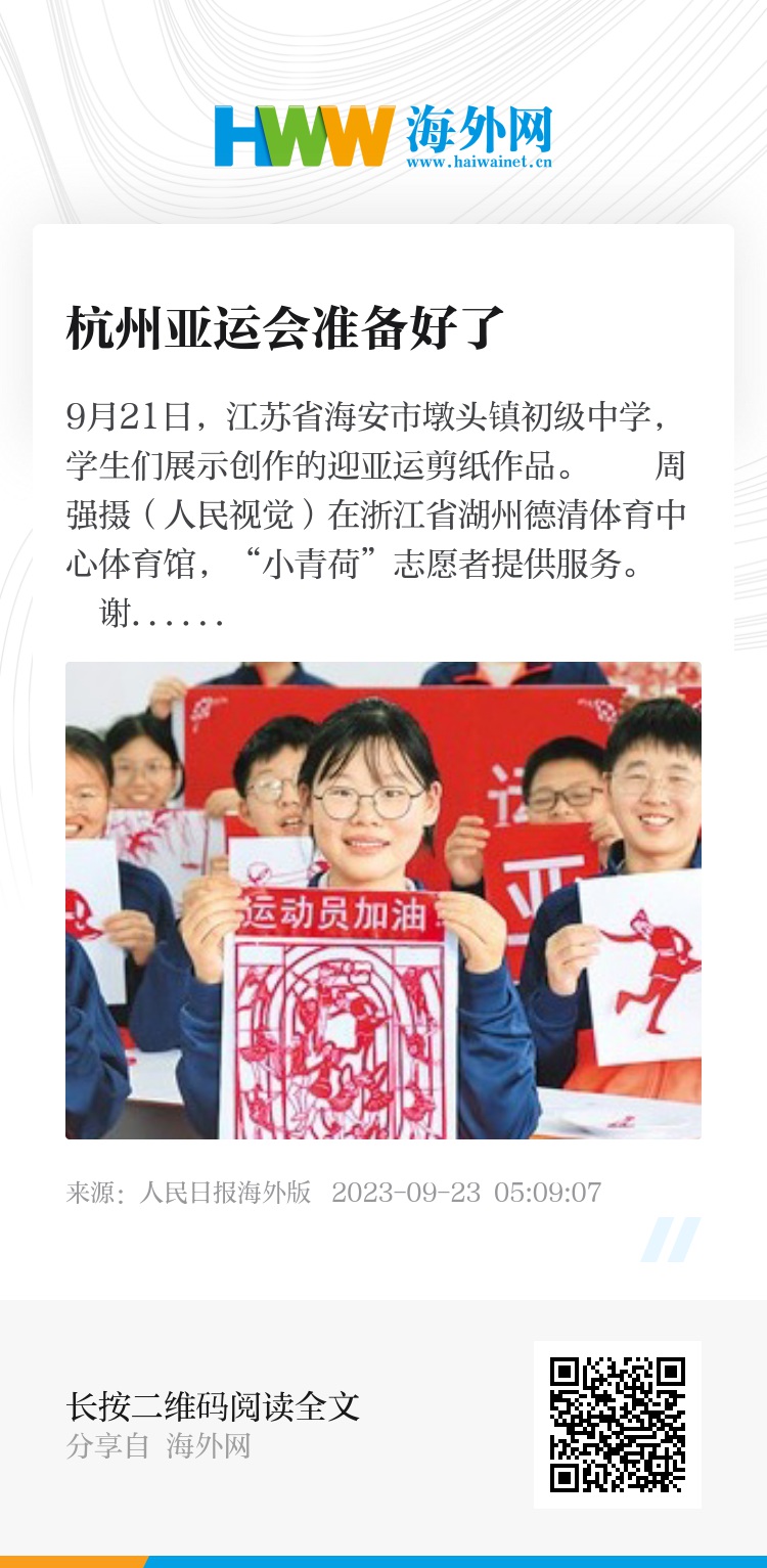 9月21日,江苏省海安市墩头镇初级中学,学生们展示创作的迎亚运剪纸作品。