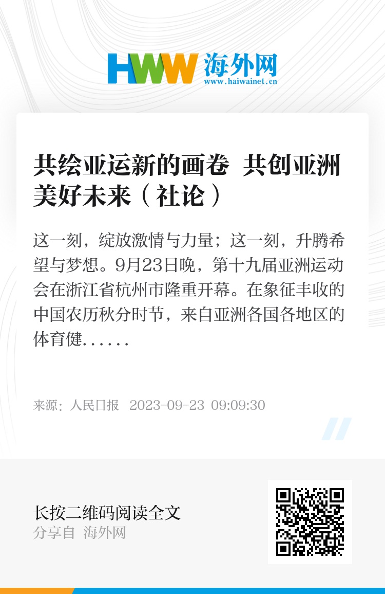 体育是社会发展和人类进步的重要标志,是增进人民友谊的纽带。作为亚洲地区规模最大的综合性体育运动会,亚运会激扬体育精神、展现亚洲风采、促进友谊团结,不断提升亚洲地区的竞技体育水平,成为亚洲体育团结合作的重要平台。中国人民热爱体育、热爱亚运,始终是亚洲体育事业的坚定参与者、积极推动者、重要贡献者。亚运会激发了中国人民参与体育运动的热情,见证着中国体育事业取得的成就。杭州亚运会报名参赛人数创历届之最,是亚运史上规模最大、项目最多、覆盖面最广的一届,充分彰显亚洲体育文化的多元性和包容性,必将在亚运史上留下浓墨重彩的一笔,为这一重要体育赛事注入新活力。