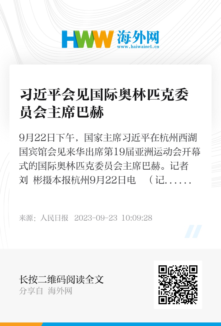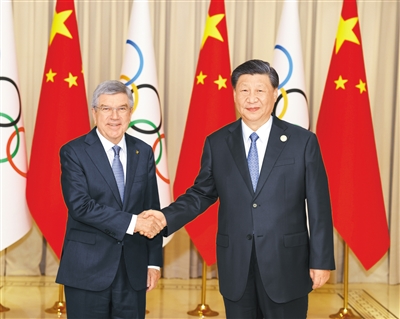 习近平强调,中国一贯重视发展体育事业,积极参与国际奥林匹克事务,践行“更快、更高、更强——更团结”的奥林匹克格言。去年中国克服新冠疫情等挑战,向世界奉献了一届“简约、安全、精彩”的北京冬奥会,北京成为全球首个“双奥之城”。中国传播奥林匹克精神的脚步永不停歇,愿同国际奥委会一道,坚持体育非政治化原则,充分利用北京冬奥会遗产,为推进奥林匹克事业和构建人类命运共同体作出新的更大贡献。目前,杭州亚运会的准备工作已经就绪。中国政府和中国人民完全有信心呈现一届“中国特色、亚洲风采、精彩纷呈”的体育盛会,为推动奥林匹克运动发展、促进亚洲人民团结和友谊作出新的贡献。