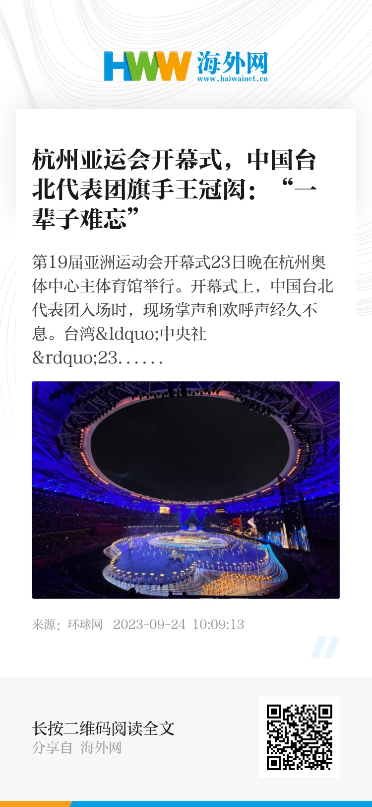第19届亚洲运动会开幕式23日晚在杭州奥体中心主体育馆举行。开幕式上,中国台北代表团入场时,现场掌声和欢呼声经久不息。台湾“中央社”23日报道称,由中国台北代表团运动员王冠闳、罗嘉翎担任旗手,现场观众欢呼声,让王冠闳直呼:“一辈子难忘”。