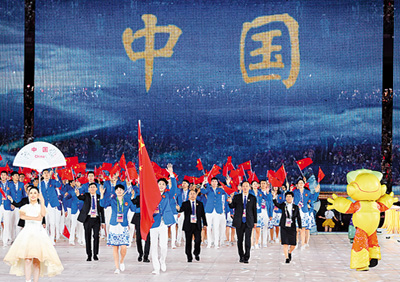 气势宏大的《歌唱祖国》奏响,包括886名运动员在内的中国体育代表团最后入场,全场一片欢腾,掌声欢呼声此起彼伏。本届亚运会上,中国健儿将参加38个大项、407个小项的角逐。