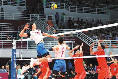 9月22日,在杭州亚运会男排前12名交叉赛中,中国队以3比1战胜印度尼西亚队。图为中国队球员彭世坤(左一)在比赛中扣球。新华社记者 朱 峥摄