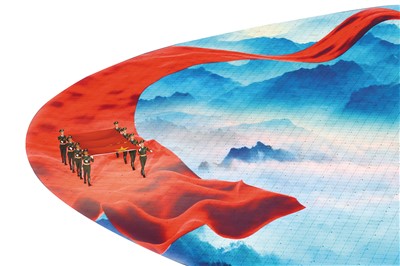 地屏上,一幅红绸飞掠壮丽河山。8名仪仗兵步伐铿锵,护旗入场。“我爱你中国,我爱你春天蓬勃的秧苗……”动人的赞歌深情唱响。