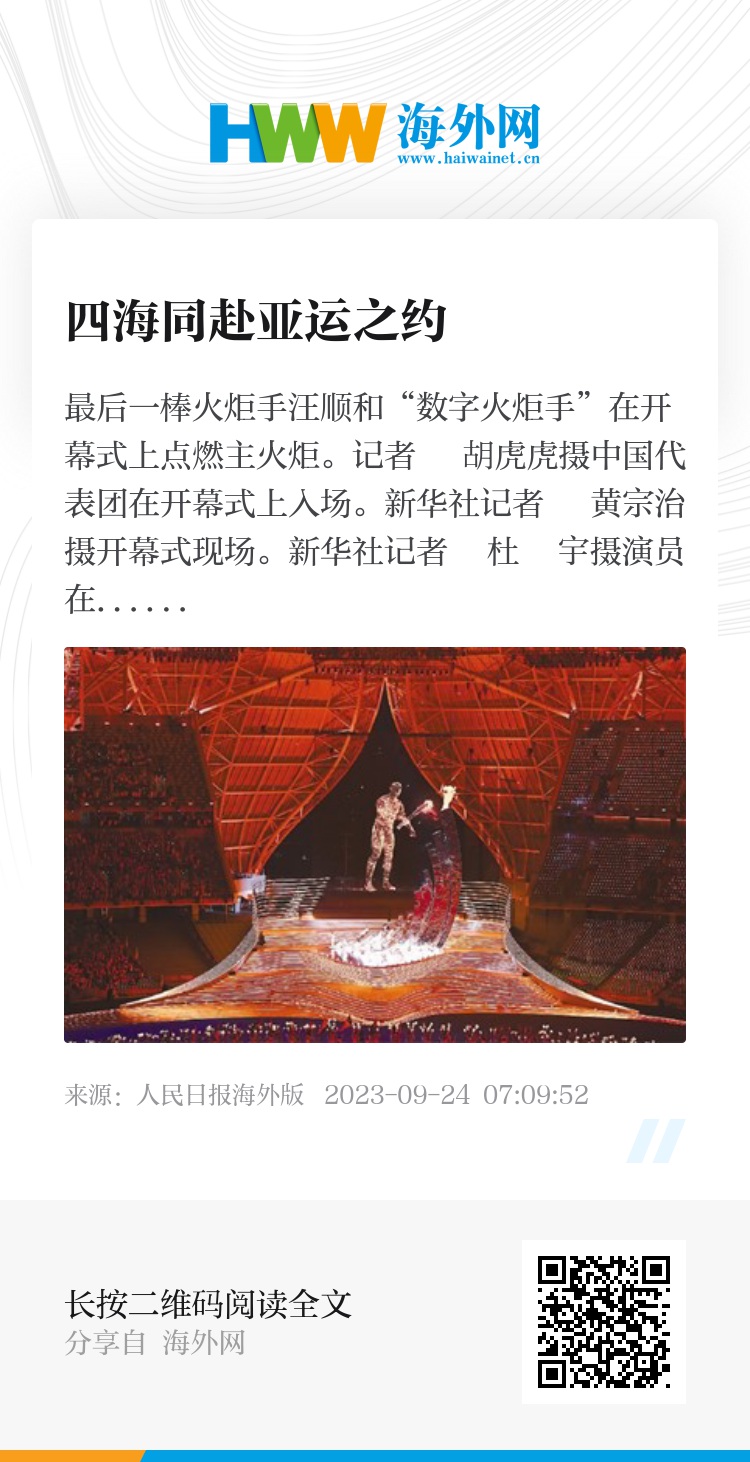 体育是人类共通的语言。亚运火炬熊熊燃烧,钱江潮涌滚滚向前。它们将共同见证,亚洲体育健儿在“更快、更高、更强——更团结”的奥林匹克格言激励下奋勇拼搏的身姿,见证中国与亚洲宾朋一道携手写就“心心相融,爱达未来”的和美诗篇,也必将见证,中国政府和中国人民用一届“中国特色、亚洲风采、精彩纷呈”的体育盛会,为推动奥林匹克运动发展、增进亚洲人民的团结和友谊作出新的贡献。