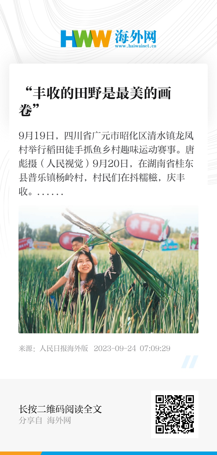 网友表示,中国农民丰收节既是亿万农民庆丰收、晒丰收的节日,也是全社会享丰收、助增收的节日。“人民勤俭辛劳甚,累进丰收是逐年。”为丰产丰收的农业、安定祥和的农村、幸福安康的农民点赞!(记者 叶 子)