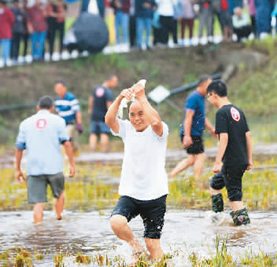 9月19日,四川省广元市昭化区清水镇龙凤村举行稻田徒手抓鱼乡村趣味运动赛事。唐 彪摄(人民视觉)