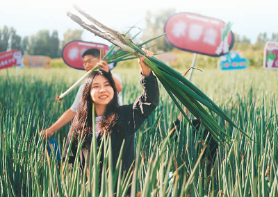 9月20日,在北京市平谷区东高村镇赵家务村大葱种植基地,市民体验拔大葱。新华社记者 任 超摄