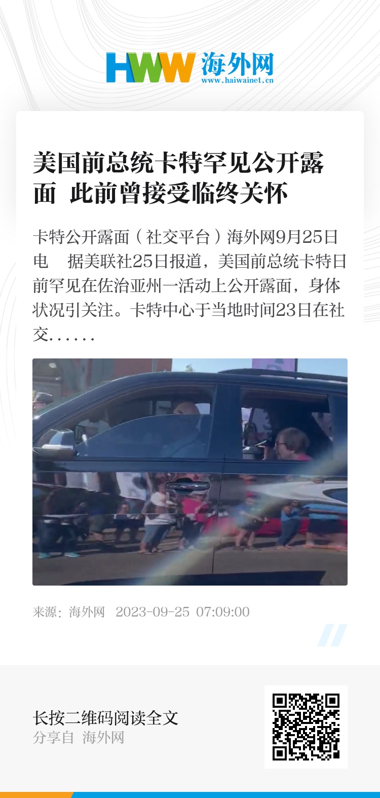 海外网9月25日电 据美联社25日报道,美国前总统卡特日前罕见在佐治亚州一活动上公开露面,身体状况引关注。