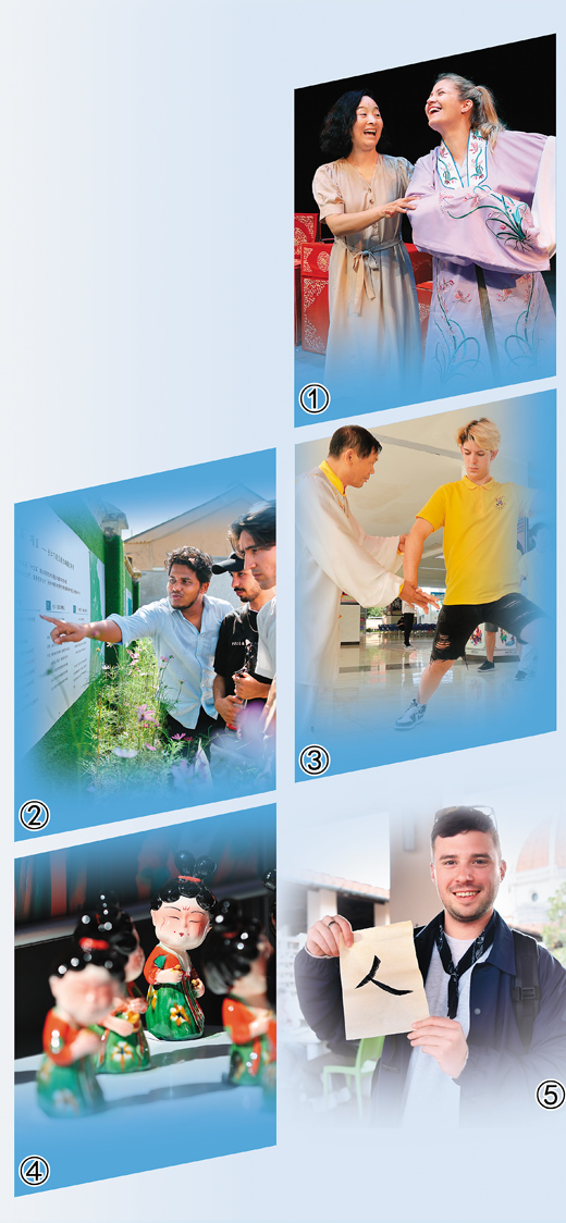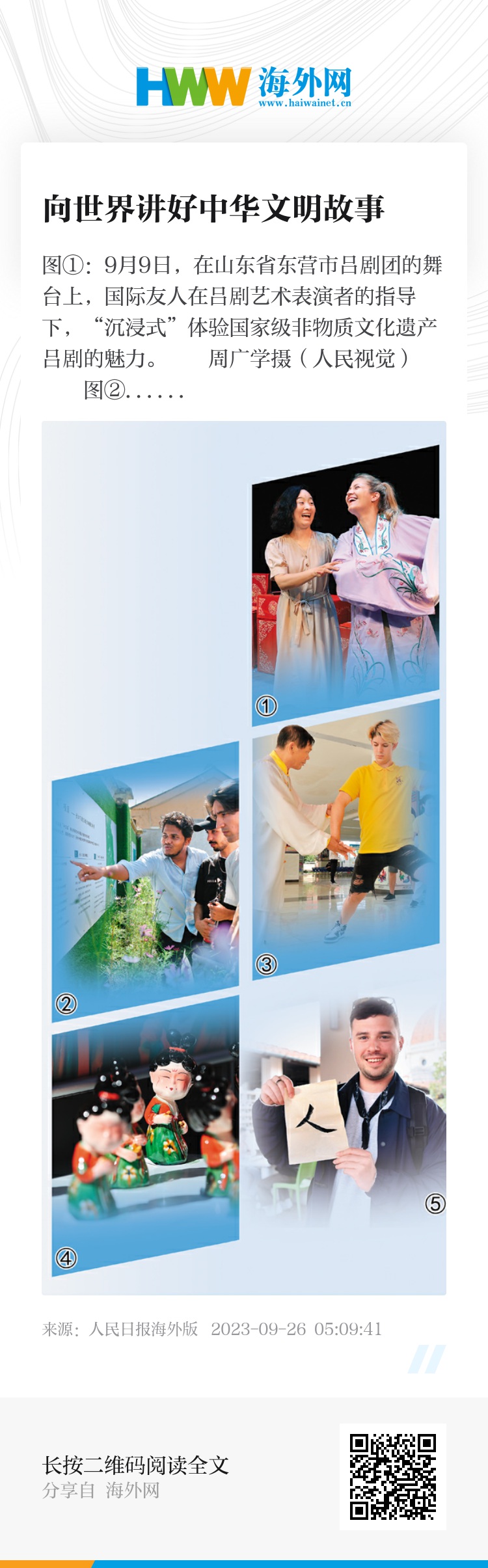 图①:9月9日,在山东省东营市吕剧团的舞台上,国际友人在吕剧艺术表演者的指导下,“沉浸式”体验国家级非物质文化遗产吕剧的魅力。