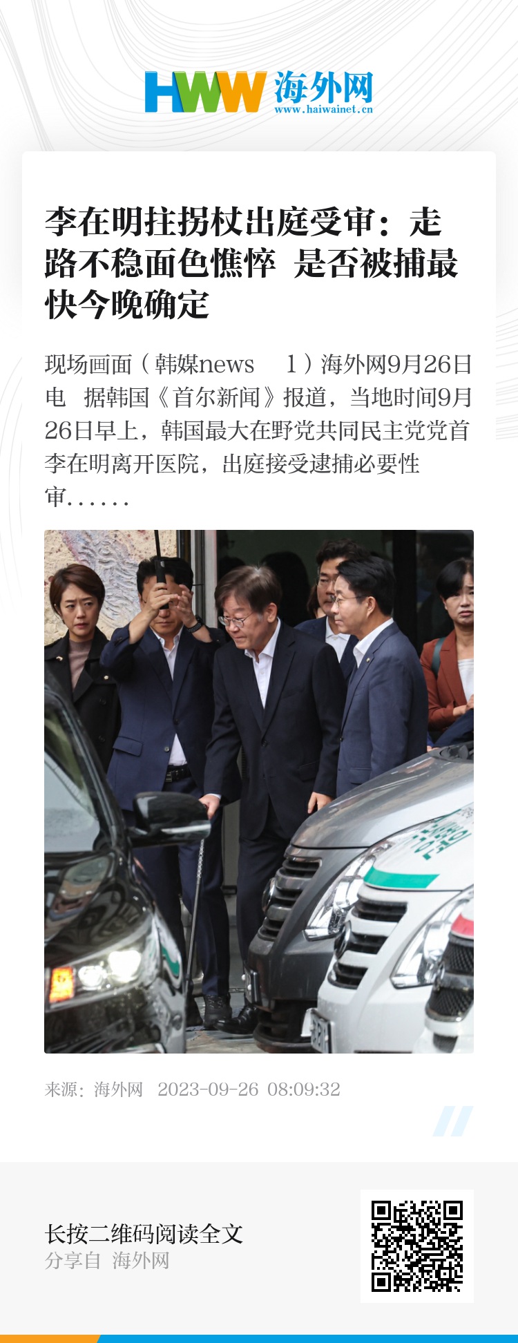 李在明身着黑色西服,拄拐杖走出医院,刚刚结束20多天绝食的他走路有些不稳,面色憔悴。他微笑着与送别的握手,周围支持者高呼“加油”。