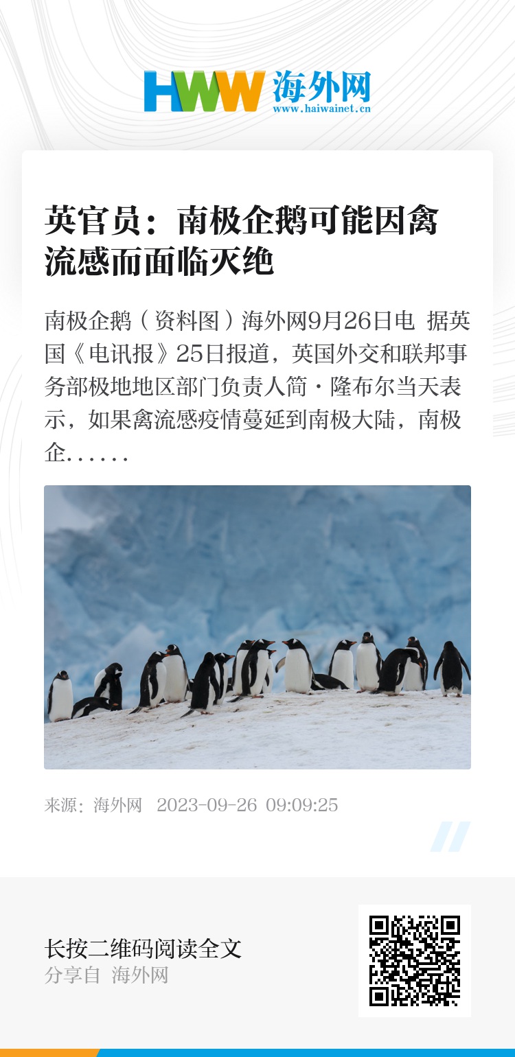 海外网9月26日电 据英国《电讯报》25日报道,英国外交和联邦事务部极地地区部门负责人简·隆布尔当天表示,如果禽流感疫情蔓延到南极大陆,南极企鹅可能会面临大规模灭绝的危险。